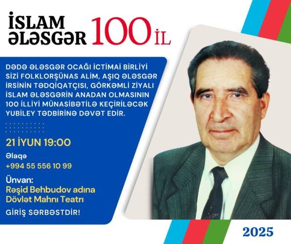 Dədə Ələsgər Ocağı İctimai Birliyi sizi folklorşünas alim, Aşıq Ələsgər irsinin tədqiqatçısı, görkəmli ziyalı İslam Ələsgərin anadan olmasının 100 illik yubileyi münasibətilə keçiriləcək xatirə tədbirinə dəvət edir.