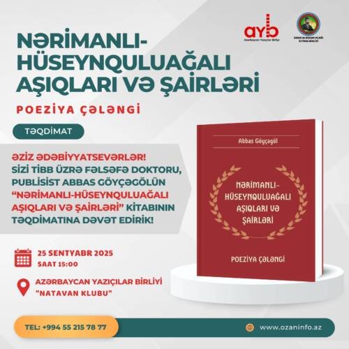 Sizi Azərbaycan Yazıçılar Birliyinin “Natəvan klubu”nda keçiriləcək “Nərimanlı-Hüseynquluağalı aşıqları və şairləri” poeziya çələngi kitabının təqdimatına dəvət edirik.